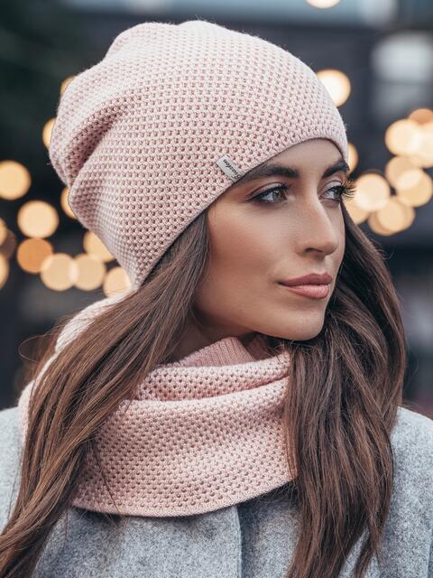 Лаконічна шапка з оригінальною шкіряною нашивкою на лацкані. Колір вироби - пудровий.